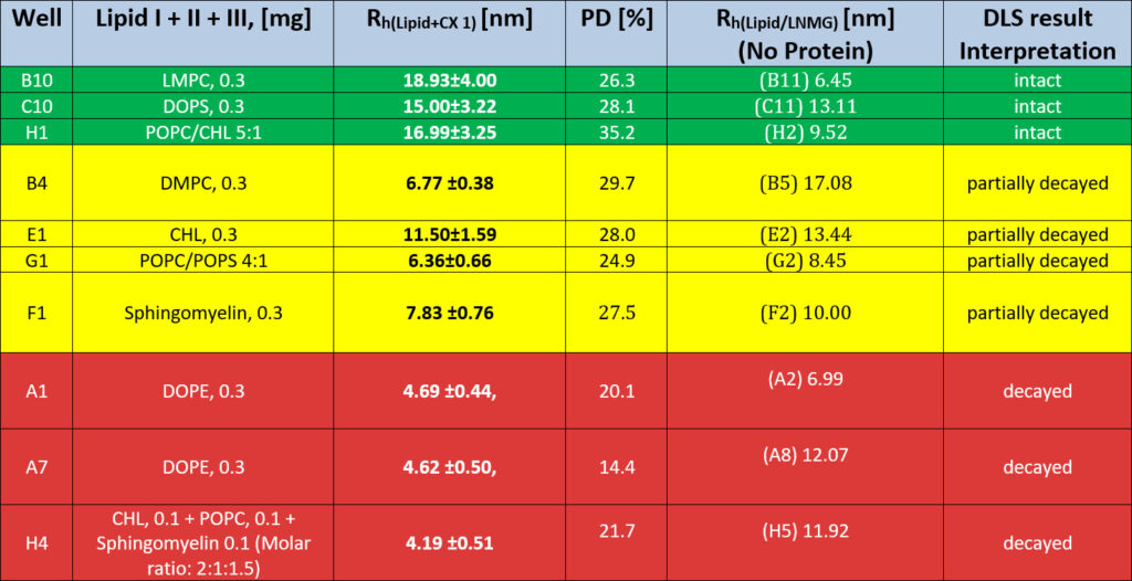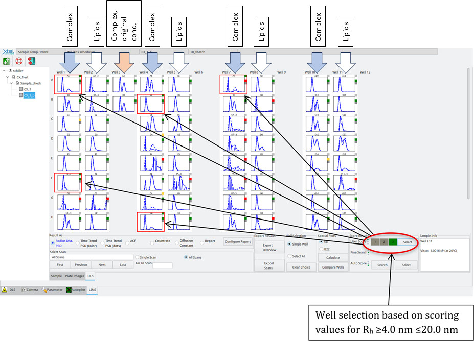What are the improved lipid conditions now? We checked two criteria: A: The protein-lipid complex must differ from the dissolved lipid. B: The sample should be similar in size to the complex in the original buffer condition and ideally less poly disperse. We checked each well pair by an applying an auto-scoring algorithm (green square in the top right-hand corner) if these criteria were met. The highest score (green) was applied to such wells, which were then selected based on the following values: Rh ≥ 4.0 nm ≤ 20.0 nm.