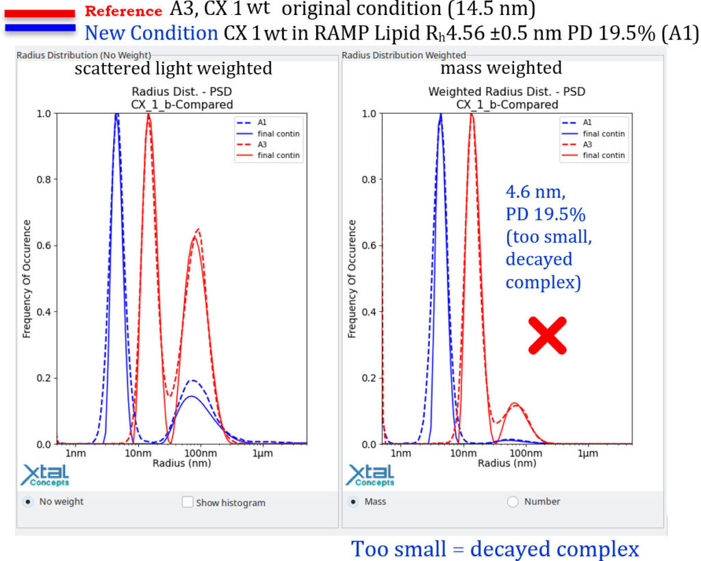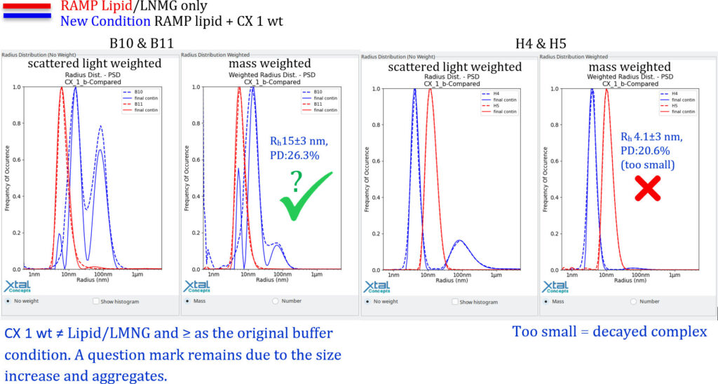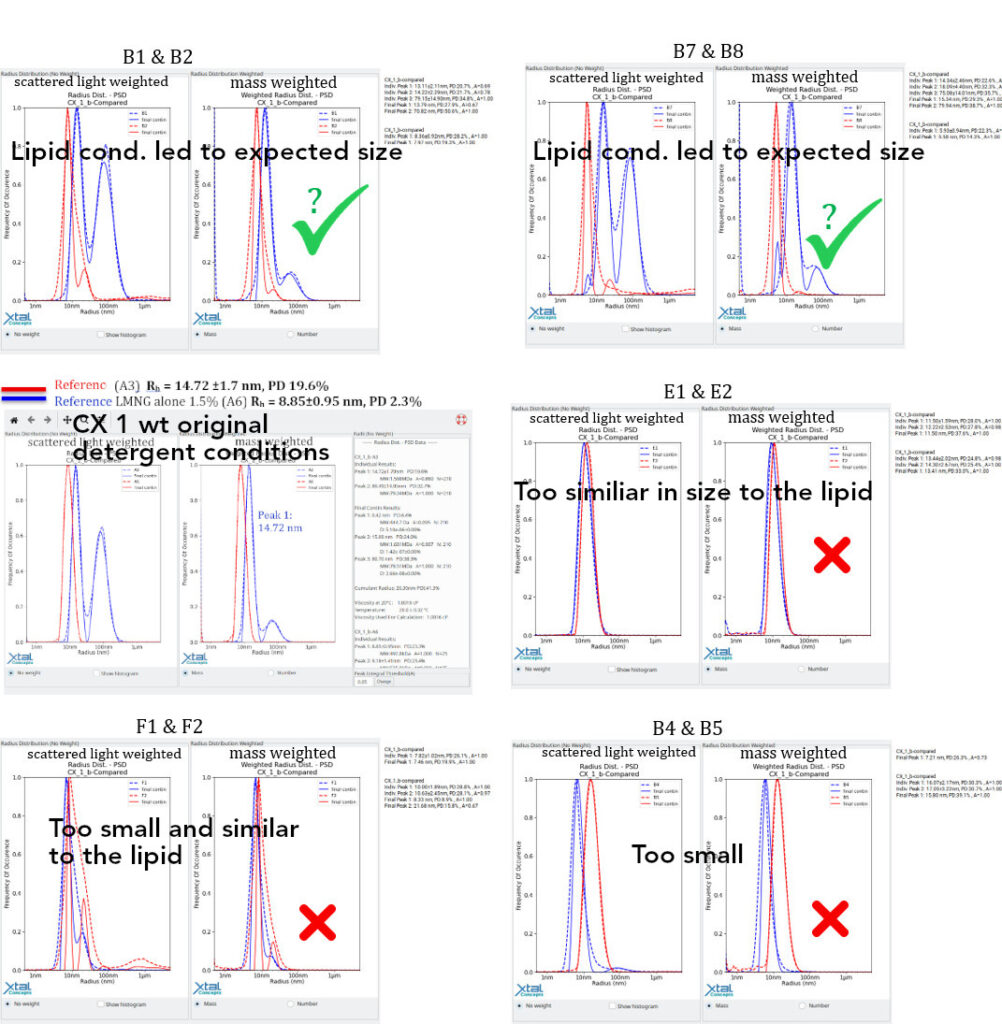 The general questions are: What happens to the lipid LMNG complex in the presence of the protein? Has it been fully adsorbed by the complex? In that case, is CX 1 wt acting as an emulsifying agent? See also B4 & B5.