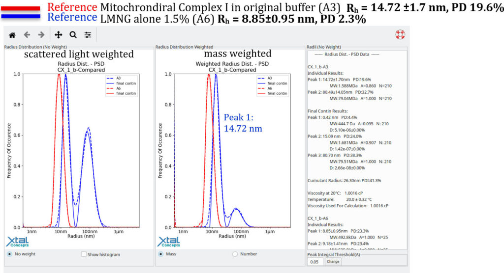 The goal is to achieve the same size distribution, or a more mono disperse distribution, with the same absolute size of the mitochondrial complex I, but in a lipid condition.