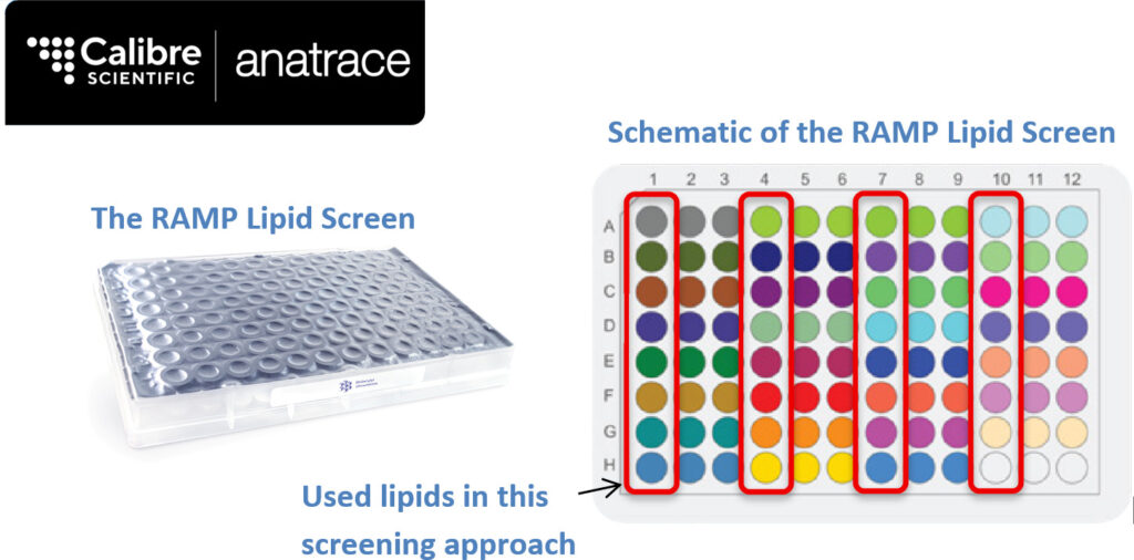 Each unique lipid condition is colour-coded in the schematic and is provided in triplicate. The first column of each triplicate was used in this screening approach.