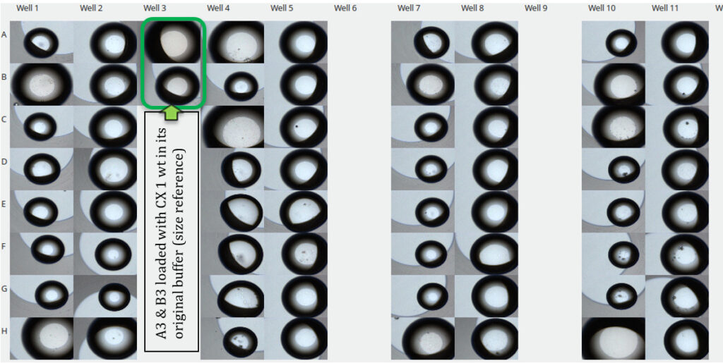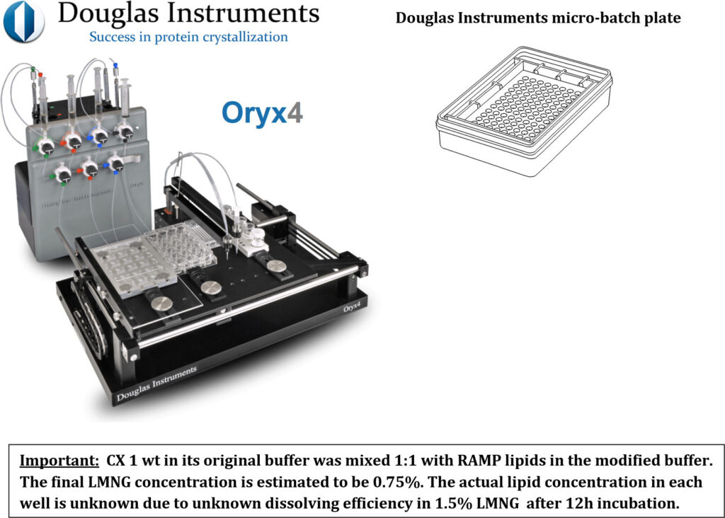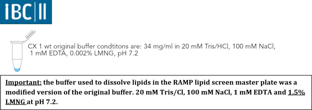 Whether a RAMP lipid improves the solubility by detergent exchange can be revealed by comparison between wells, of RAMP lipid only with RAMP lipid + CX 1 wt.