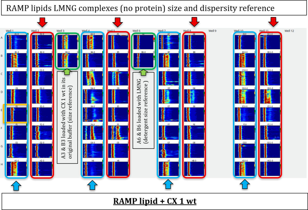 Because the lipids were solubilised by LMNG, they generate a strong DLS signal on their own, the DLS evaluation followed a characteristic size-distribution signature. For comparison, the LMNG lipid buffer was loaded without protein to determine the resulting size distribution. The same condition was then loaded with protein to observe any size differences. The criteria were based on changes in particle size, distribution profile, and overall monodispersity relative to the lipid-only control.